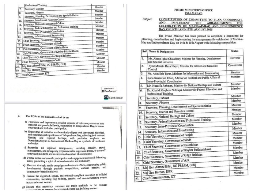 کمیٹی 14 اگست کو جشنِ آزادی اور 15 اگست کو “معرکۂ حق” کی تقریبات کے جامع انتظامات کی ذمہ دار ہوگی۔