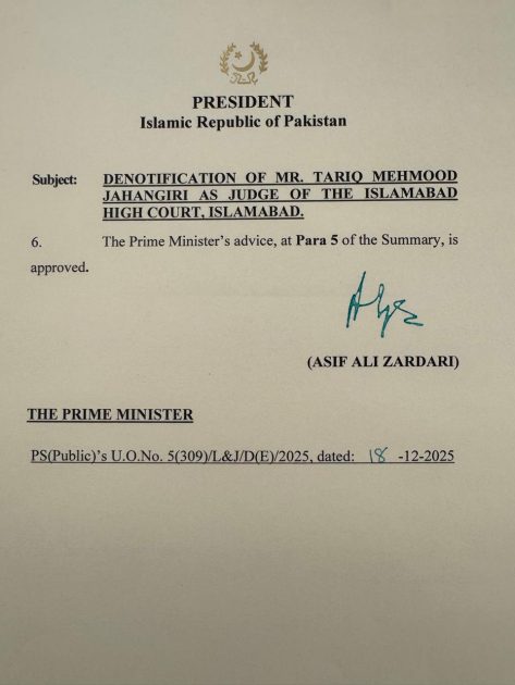 ذرائع کے مطابق صدرِ مملکت نے اسلام آباد ہائیکورٹ کے فیصلے کی روشنی میں یہ منظوری دی، جس میں عدالت نے جسٹس طارق محمود جہانگیری کی تقرری کو غیر قانونی قرار دیا تھا۔ عدالت نے فیصلے میں کہا تھا کہ تقرری کے وقت جسٹس جہانگیری درست اور اہل ایل ایل بی ڈگری کے معیار پر پورا نہیں اترتے تھے۔